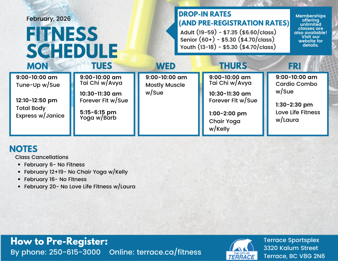 Drop in and pay a one-time fee. Pay at the front desk when you get to class; or pay during office hours (M-F, 8am to 4pm) either in person or by phone (250-615-3000). Keep your receipt and show proof of payment to the instructor prior to class. Instructors cannot accept payment.