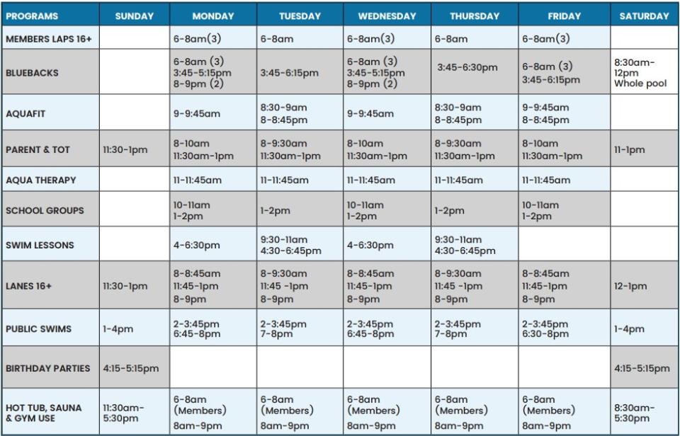 | Members Laps 16+ | 6-8:30am (3) | 6-8am | 6-8am (3) |